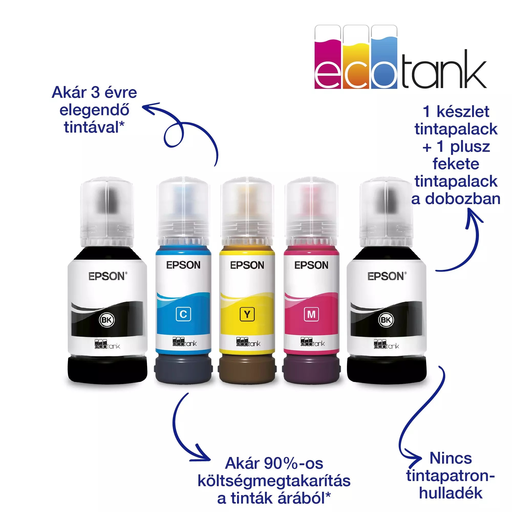 Takarítson meg akár 90%-ot a nyomtatás költségein az Epson tintapatron nélküli EcoTank nyomtatóival. Az integrált tintatartályok – amelyekhez nagy kapacitású tintapalackokat mellékelünk – a speciálisan kialakított tintapalackoknak köszönhetően könnyedén feltölthetők. Mivel a tintapatronokat nem kell cserélni, illetve a készülék rugalmas csatlakoztathatóságának és a kétoldalas nyomtatási opciónak köszönhetően ez a nyomtató tökéletes választás azok számára, akik kiváló minőségű nyomatokat szeretnének előállítani, hihetetlenül alacsony oldalankénti költség mellett.