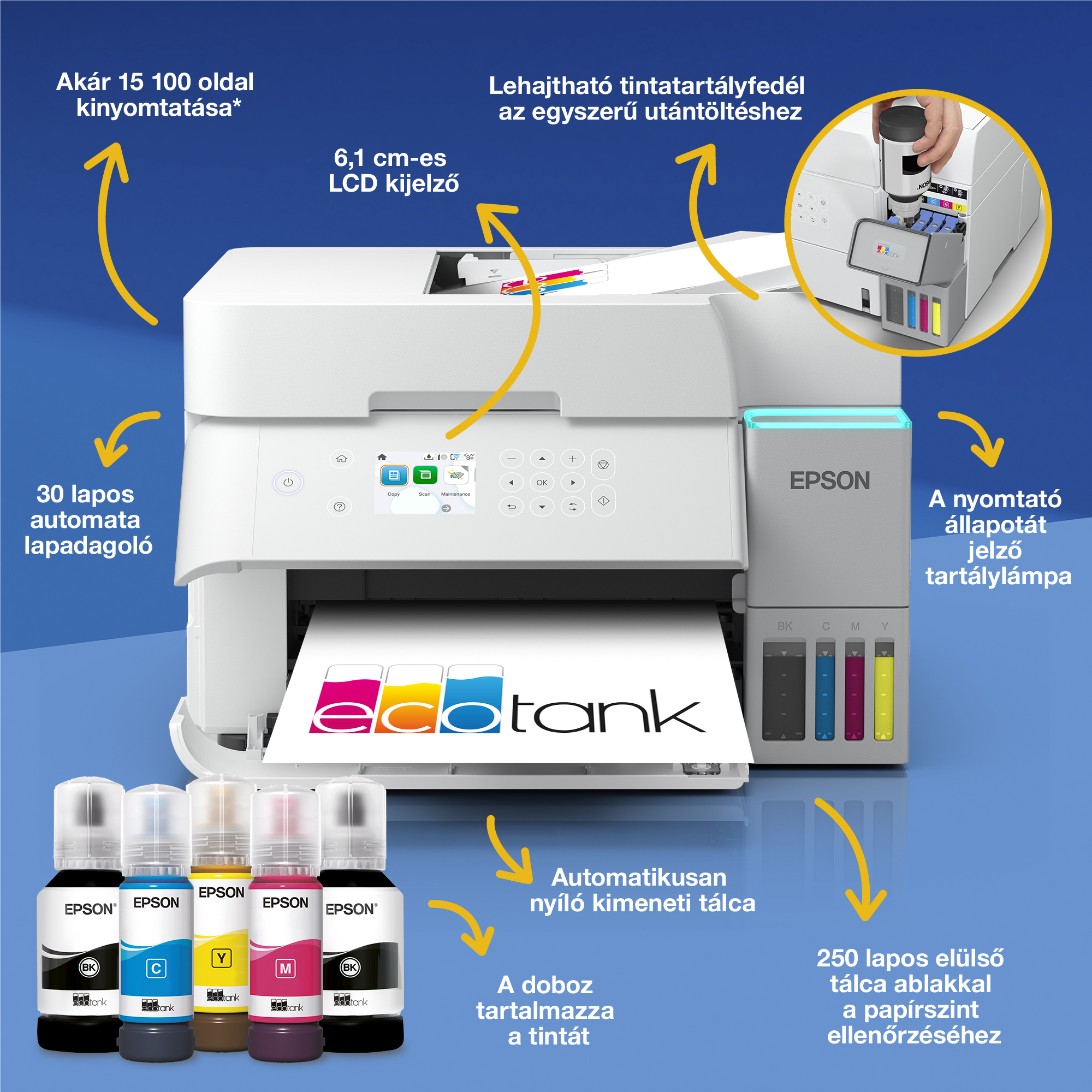 Wi-Fi, másolás és szkennelés funkciókkal ellátott, újratölthető tartályos, A4-es tintasugaras nyomtatónk alacsony költségű nyomtatást kínál.