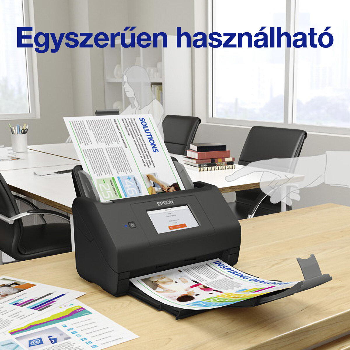 Szkenneljen közvetlenül az érintőképernyő használatával, és hozzon létre testre szabható előbeállításokat és elrendezéseket számítógép nélkül. Az Epson ScanSmart szoftverrel számítógépről (PC vagy Mac) szkennelhet és oszthat meg tartalmakat, de használhatja telefonját vagy táblagépét is, az Epson Smart Panel alkalmazással.