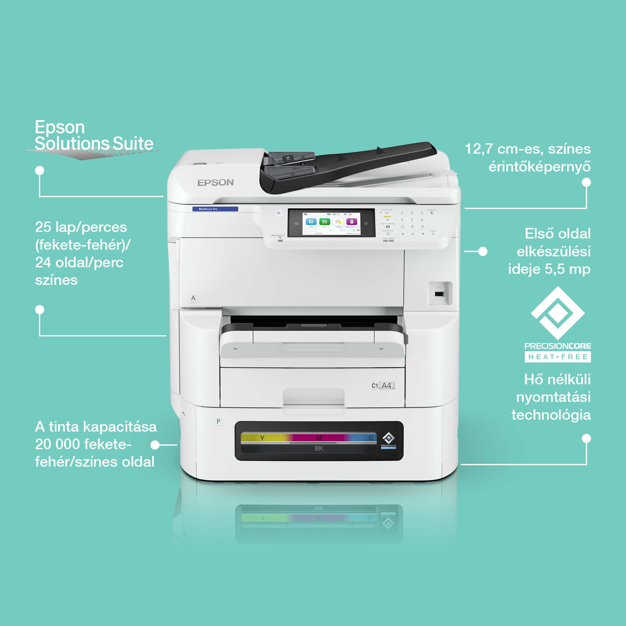 Rendkívül tartós és kevés beavatkozást igényel a nyomtatás, másolás, szkennelés és faxolás funkciókkal. A 12,7 cm-es színes érintőképernyő zökkenőmentes működést tesz lehetővé az Epson flottájával.